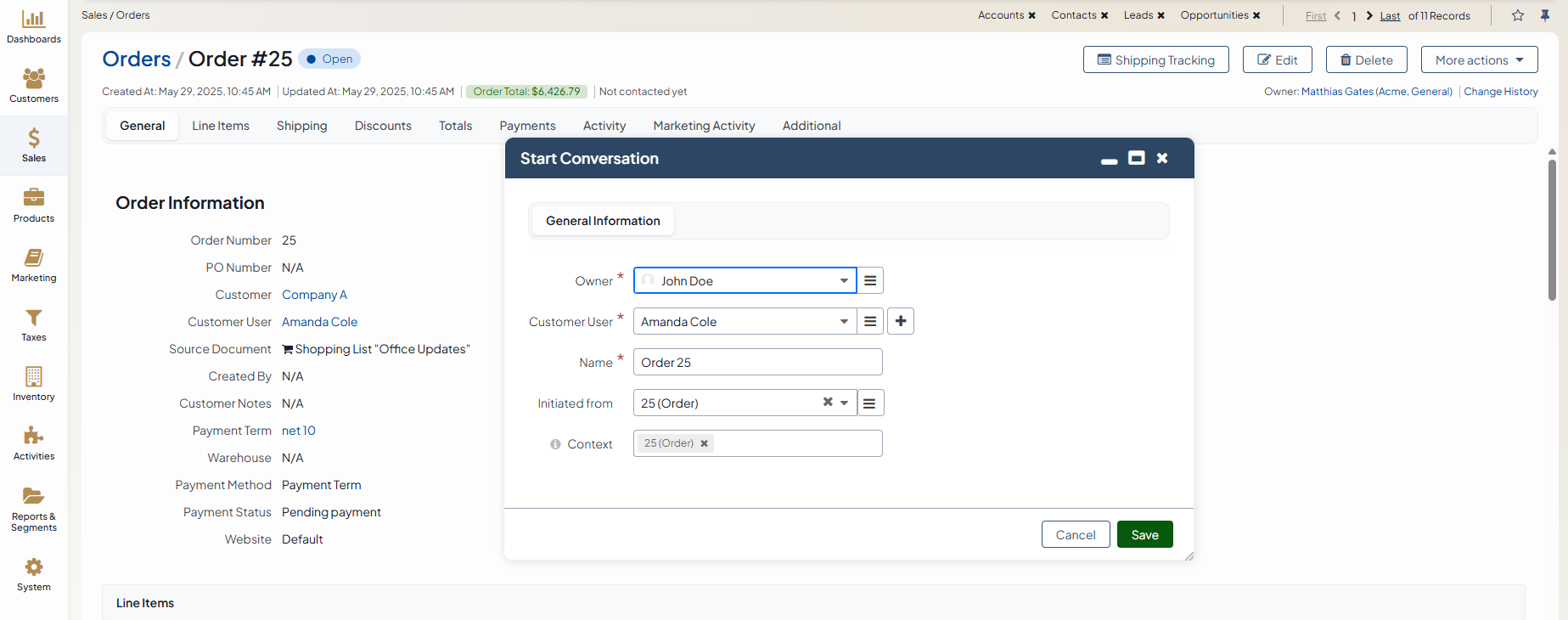 Initiated from — A source of the conversation can be a related entity, such as a order, an RFQ. This is an optional field and can be left empty.