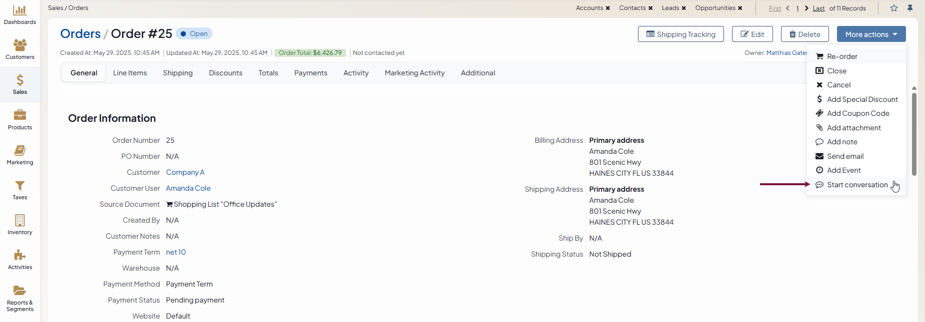 You can also click Start Conversation on the view page of a supported record under the More Actions menu on the top right. Supported records are:
