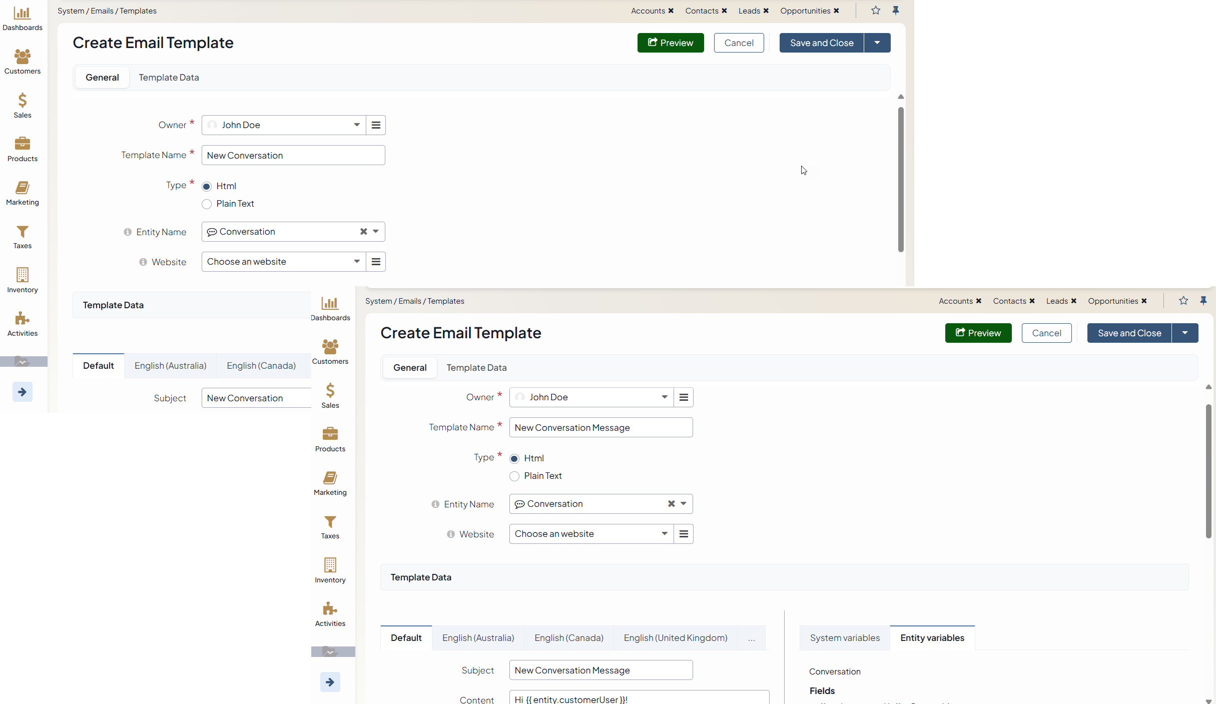entity variablesor free-form text as needed.For a new message in a conversation: Create a separate template for message events.