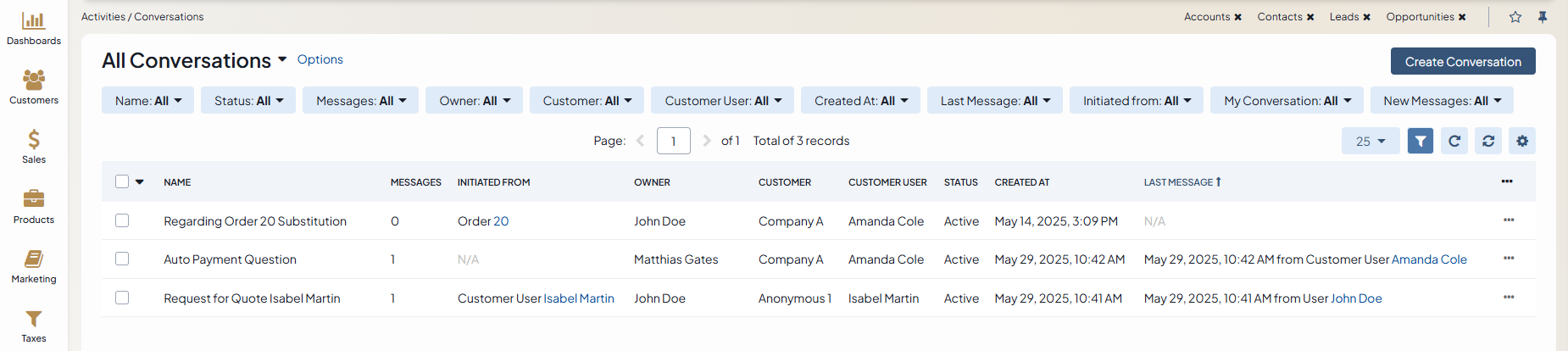 From the page of all conversations under Activities > Conversations in the main menu, where you can perform the necessary actions for a conversation.