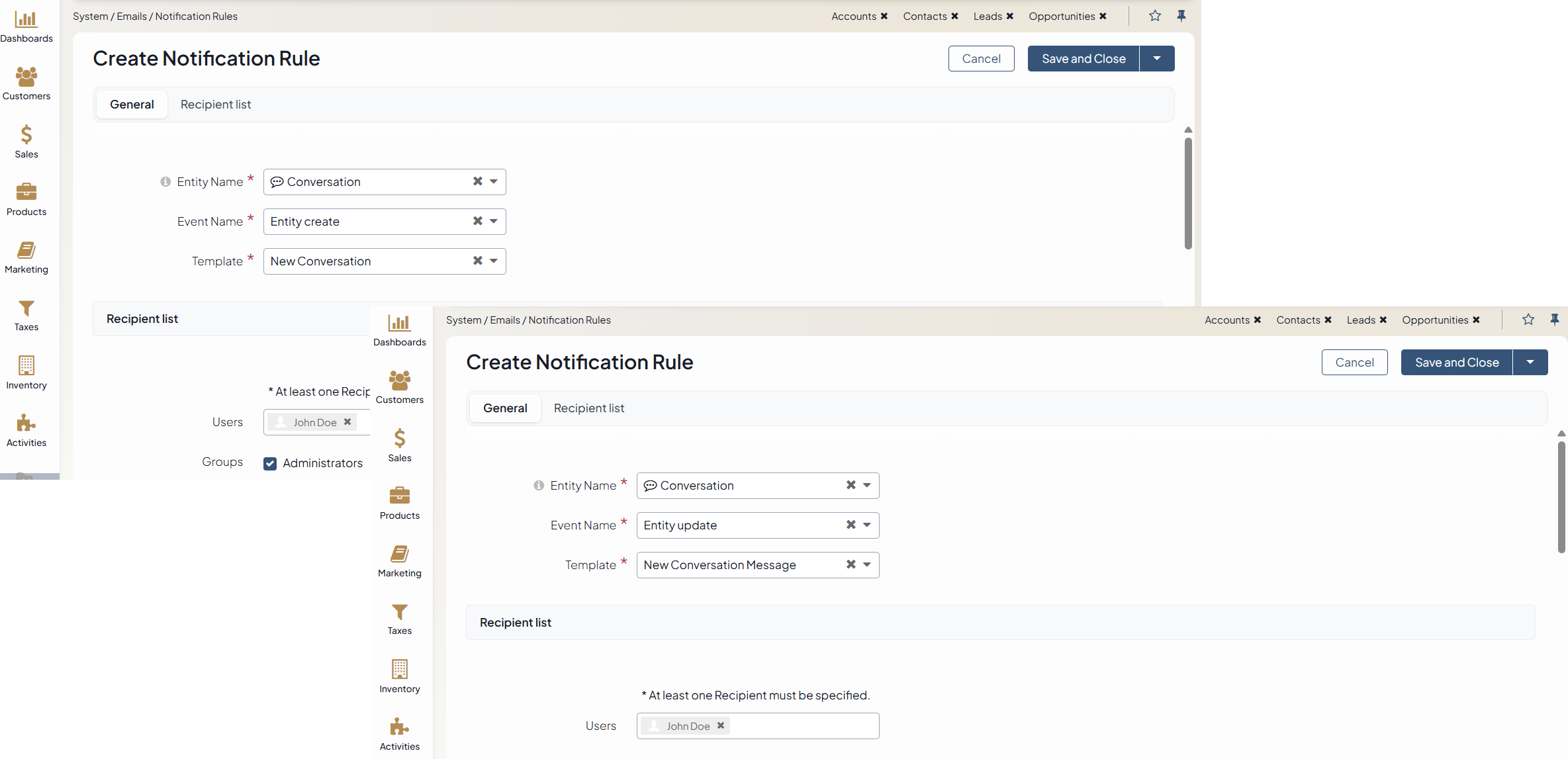 To create two notification rules: