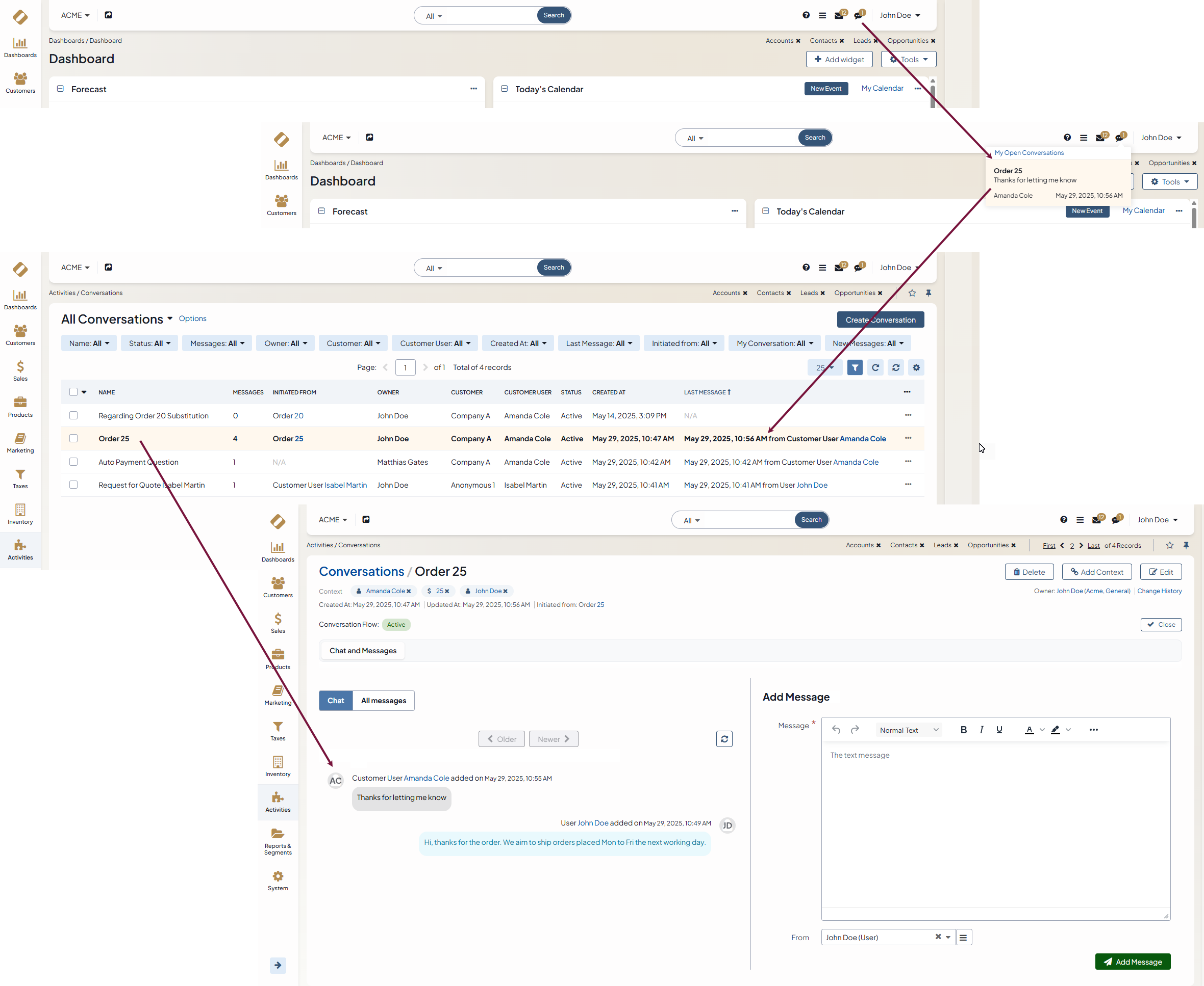 You can view, update, delete the existing conversations, and add context or a new message to them from the following pages in your Oro application: