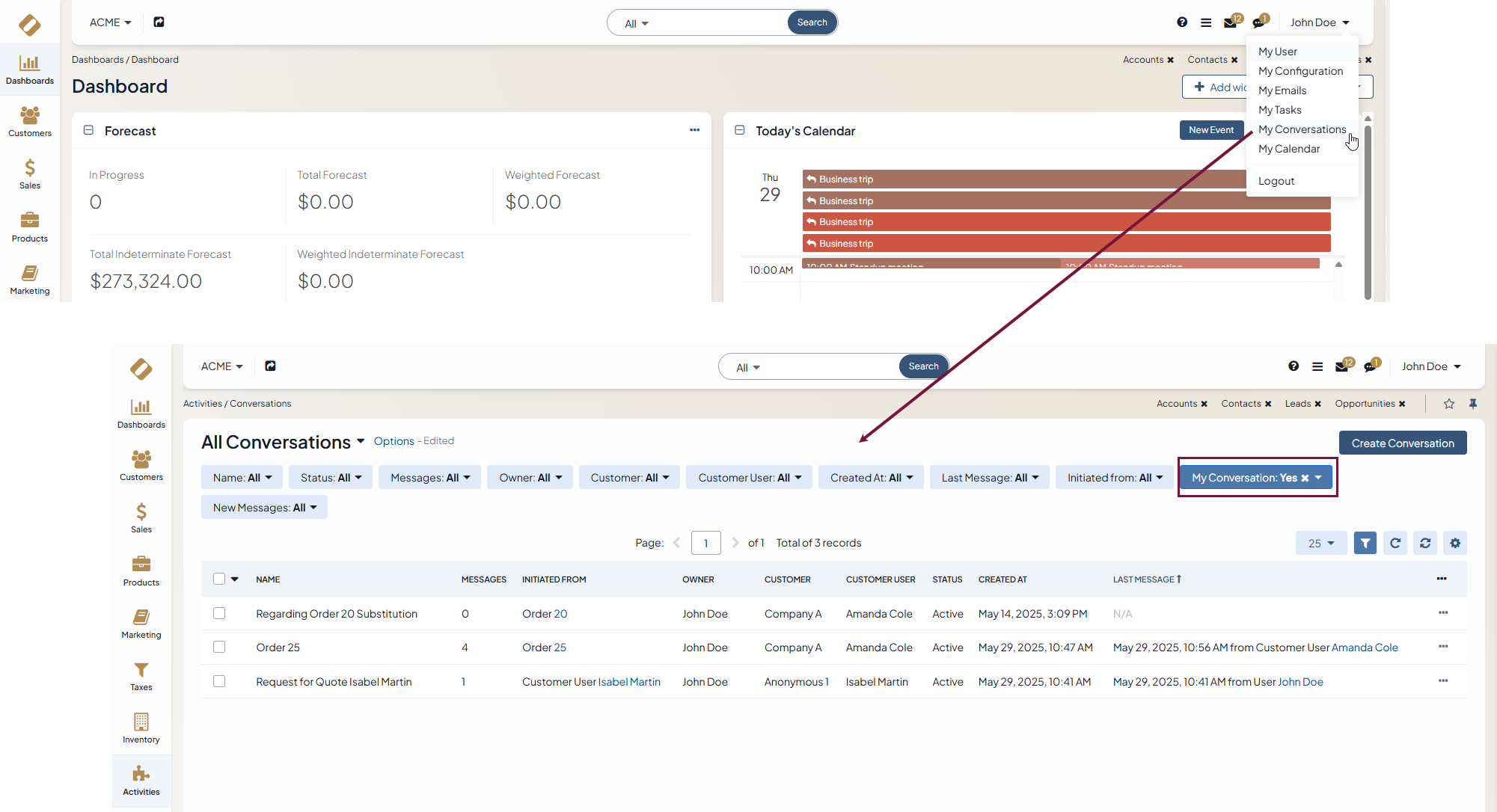 From My Conversations in the user menu. Clicking on this menu item will redirect you to the page of the conversations you initiated or are involved in. If you are an admin or a user with permission to view conversations of other users, clear the My Conversation filter.