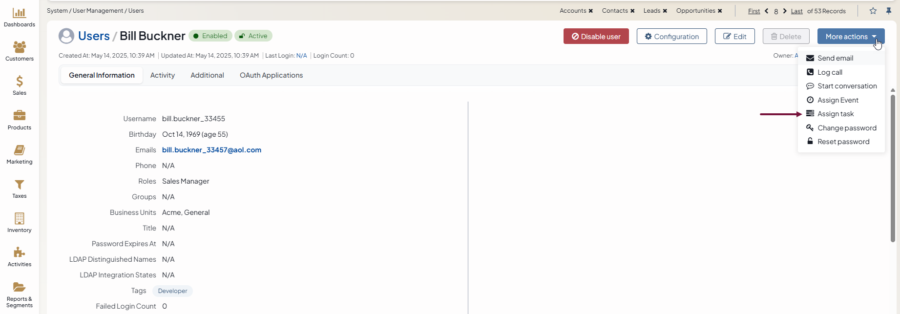 Click Create Task. The task appears in the Tasks subsection Additional Information on the user profile page.