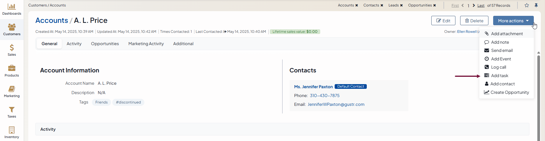 Context — Select a record that has a meaningful relation to the task. Start entering a record name, and when the list of suggestions appears, click the required name to select it. The task becomes immediately linked to the selected item and is displayed in its Activity section.