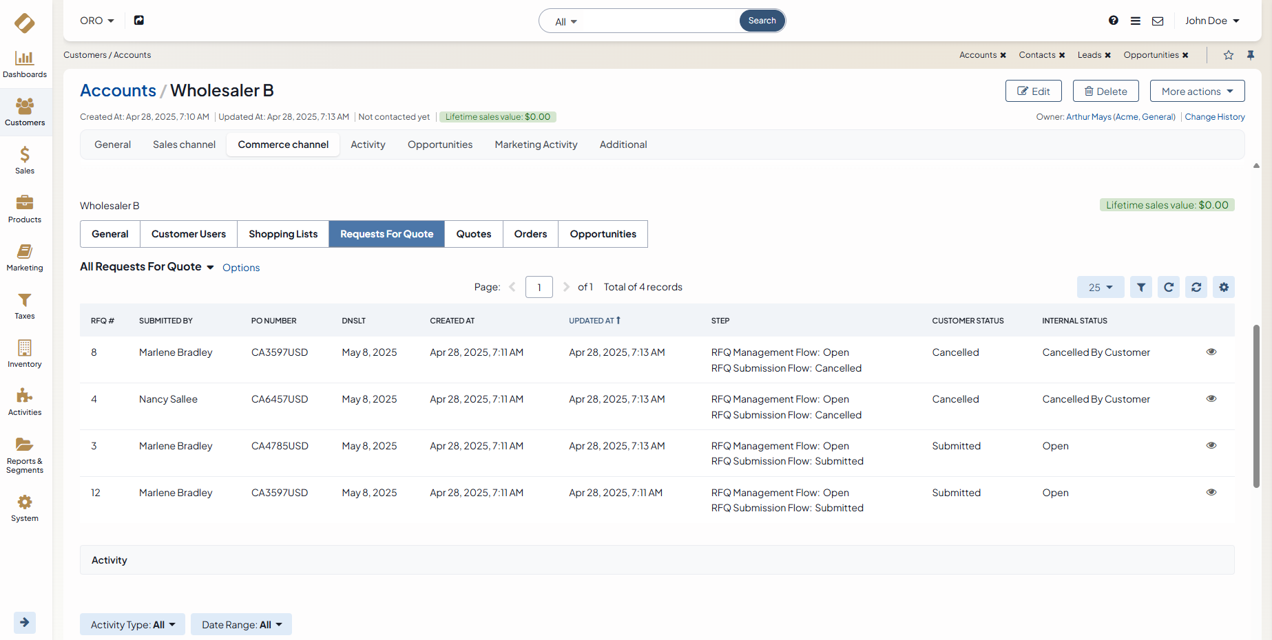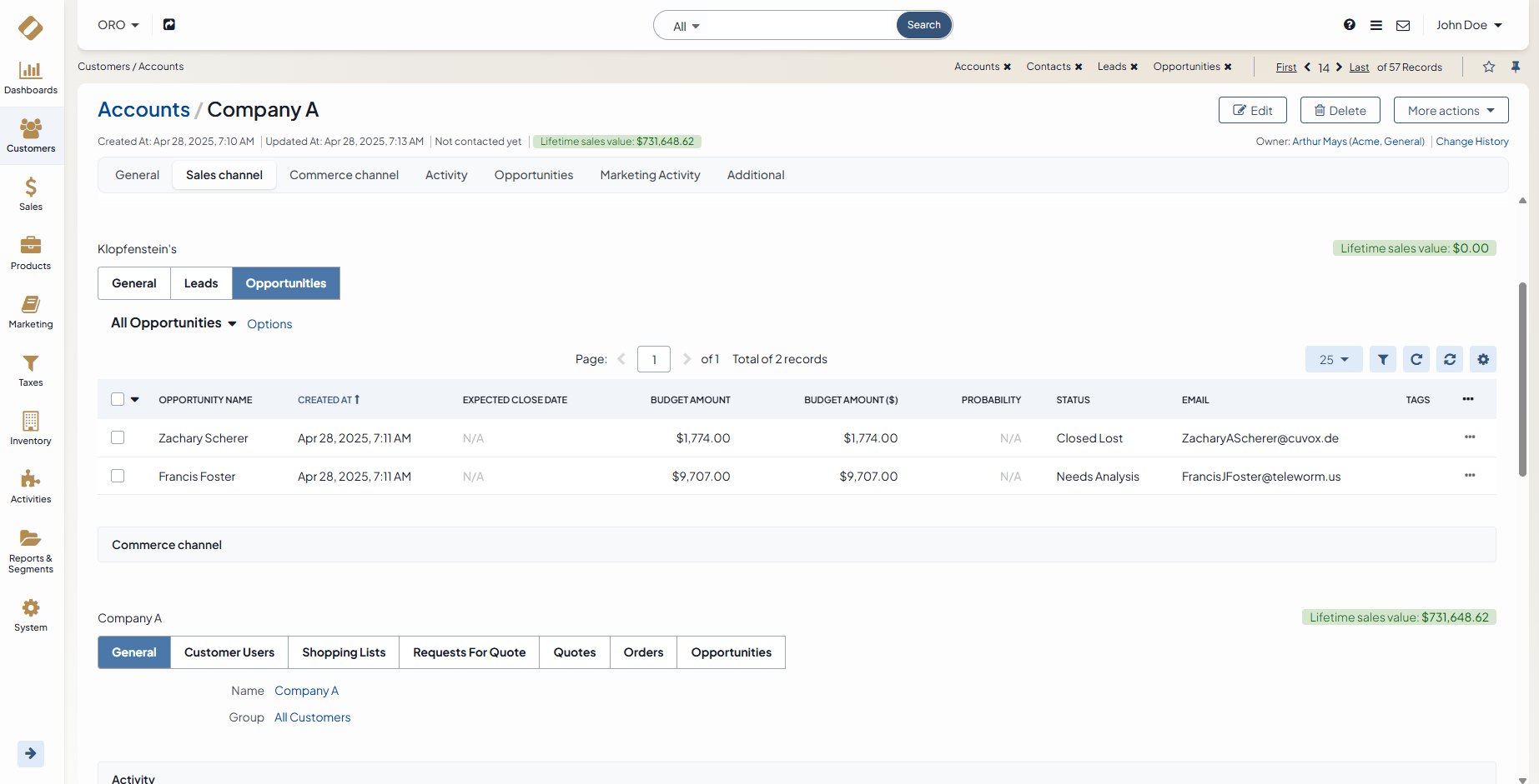 Accounts display basic data for all customers and some additional data, such as orders, quotes, or opportunities related to a particular customer. From the page of a selected account, you can view the calculated lifetime sales values metric based on orders placed by the customer linked to this account. Oro applications even let you merge several accounts if, for instance, a company data audit has discovered several accounts created to represent the same business.