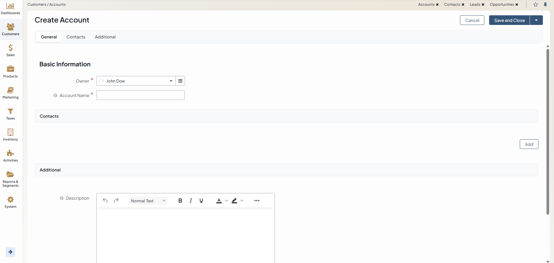 Owner — Limits the list of users that can manage the account to users whose roles allow managing accounts assigned to the owner (e.g., the owner, members of the same business unit, a system administrator, etc.). By default, the user creating the account is selected as the owner.