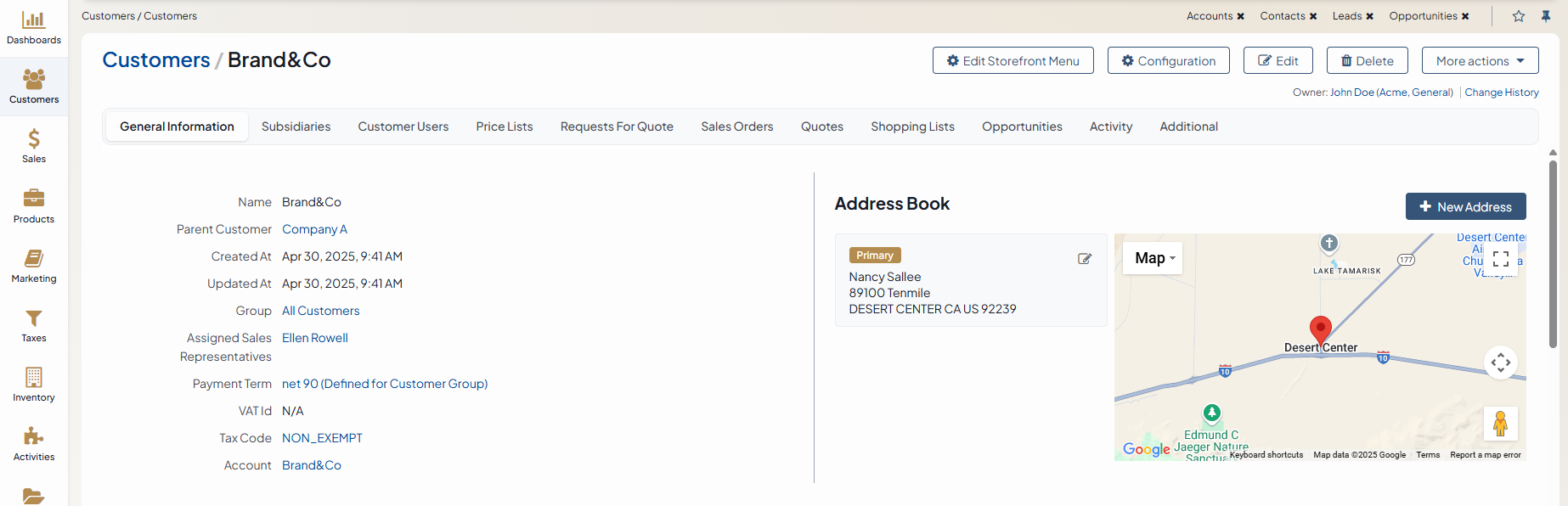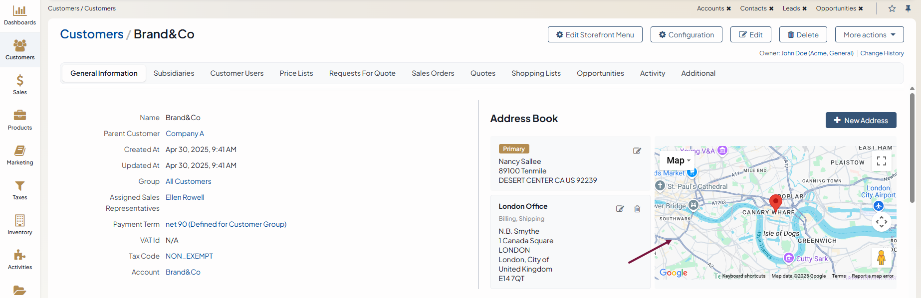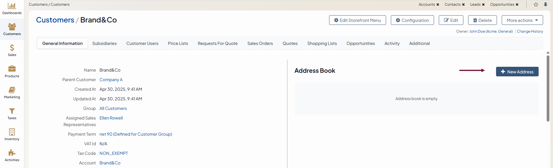 For customers, customer users, and contacts in the Oro application, the address book allows to enter and view account/customer address details.