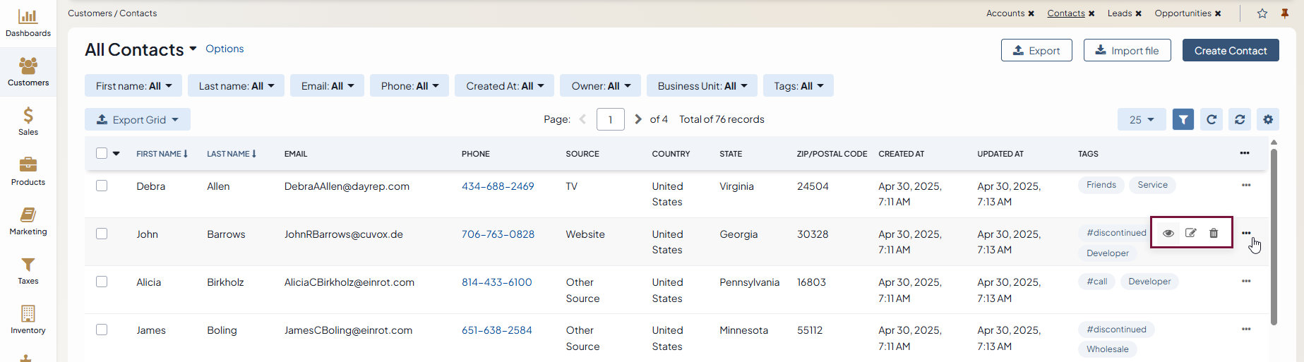 All contacts available in the system are displayed on the page of all contacts under Customers > Contacts, where you can view, edit, delete, and bulk-delete contacts.