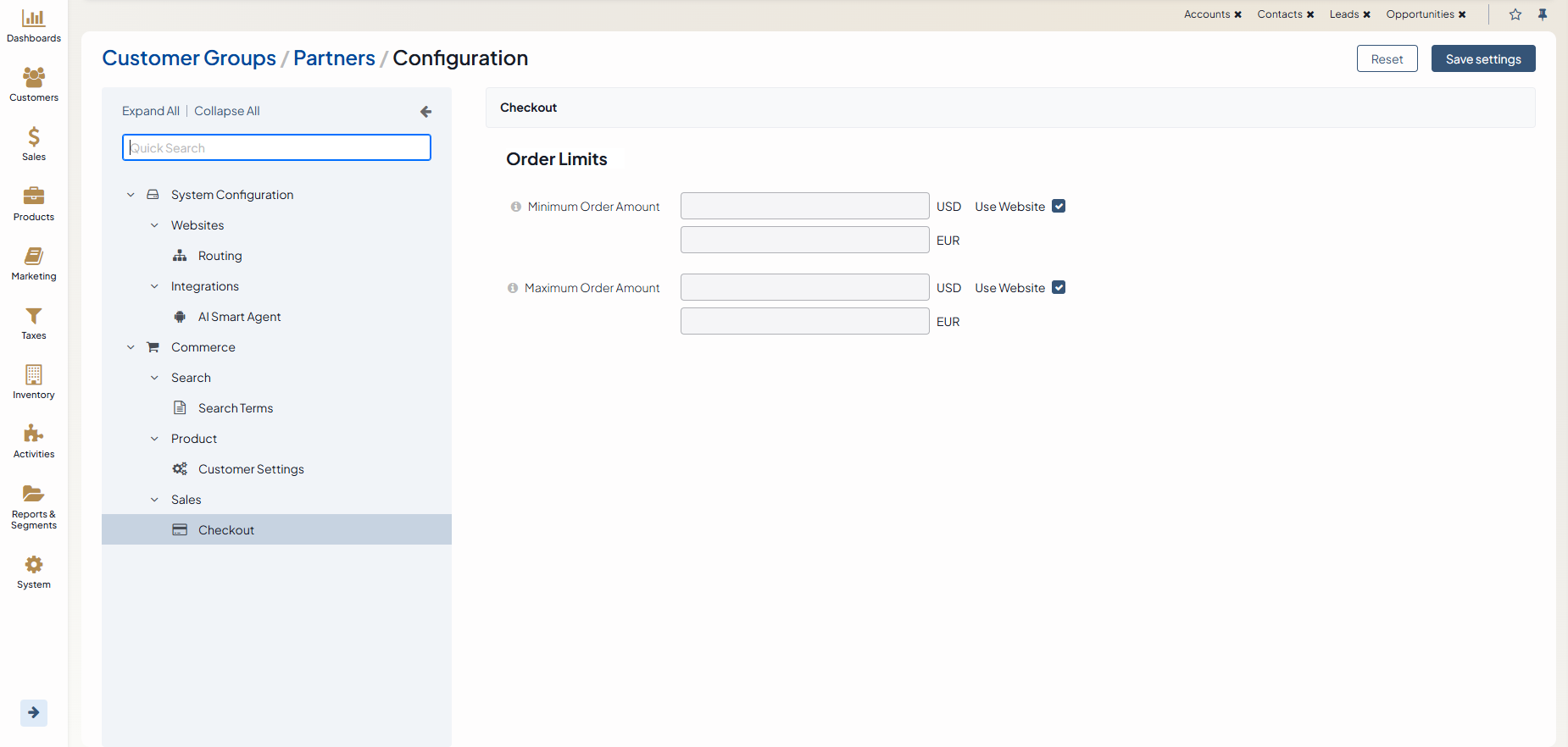 You can configure checkout settings globally, per organization, website, customer group, or customer.