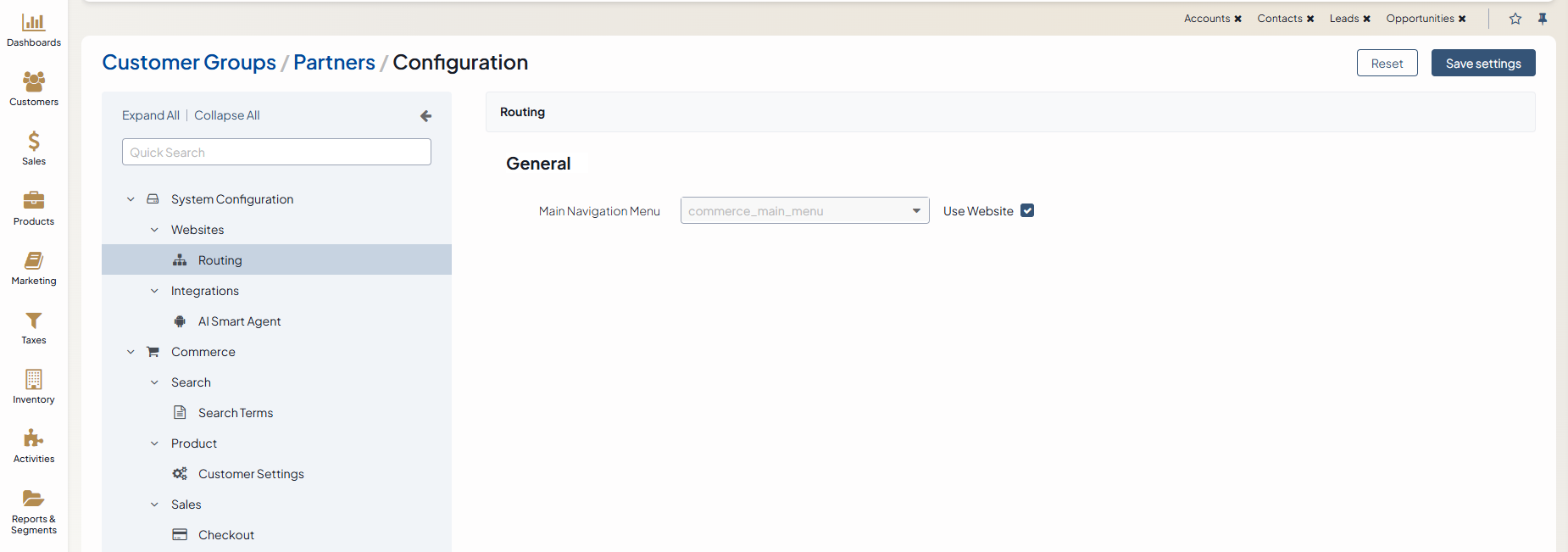The website routing settings can be configured globally, per organization, per website, customer group and customer.