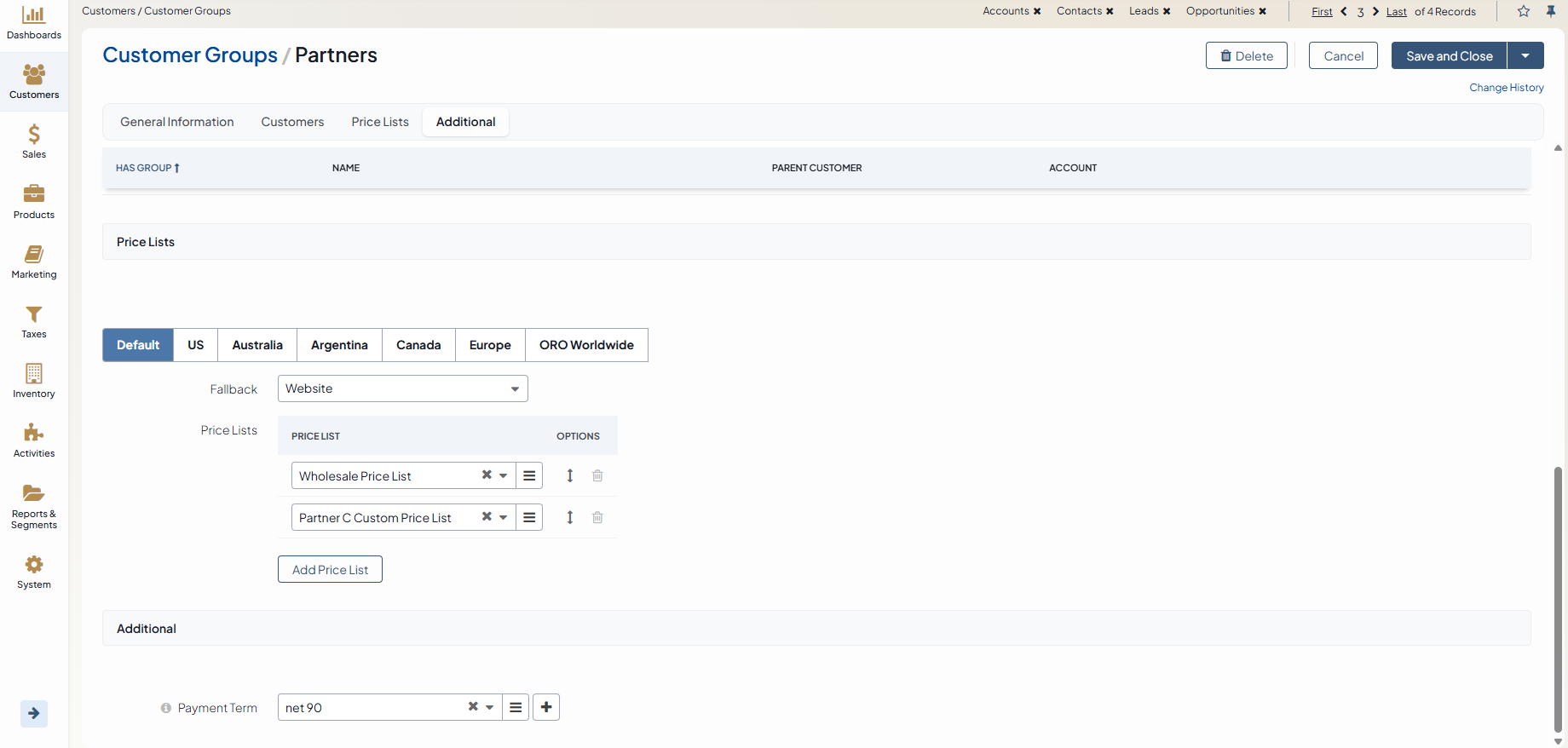 To change the price list settings for the customer group: