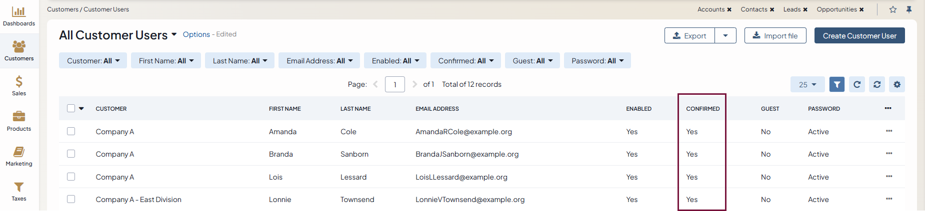 Upon registration, a customer user receives an email confirmation request. Once they follow up with the requested action, their account is marked as confirmed.