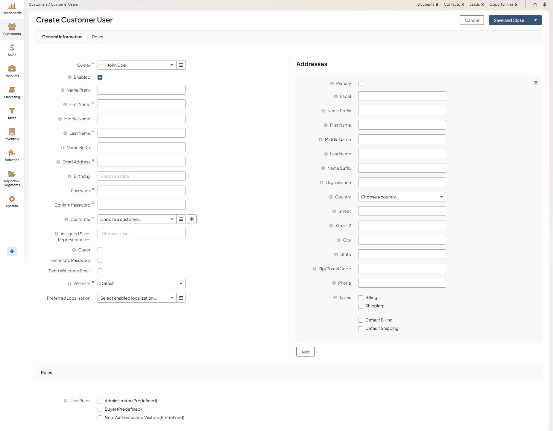 Select their roles in OroCommerce to define their level of permissions and access to the actions and data in the OroCommerce storefront.