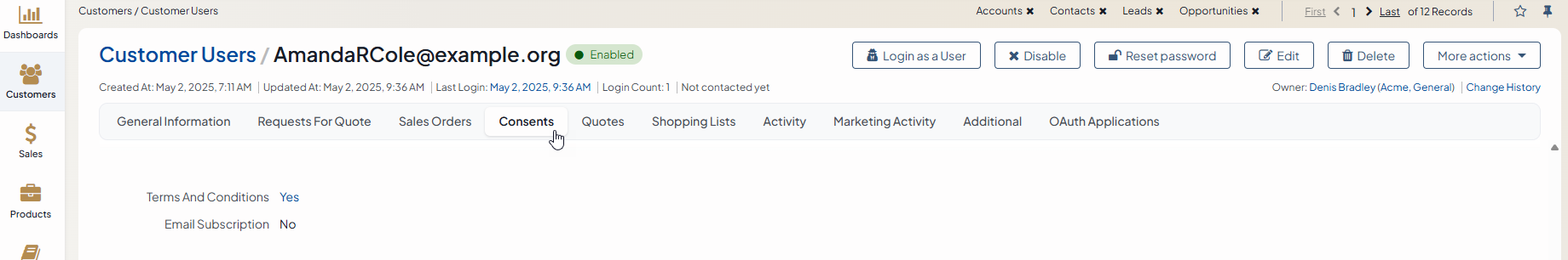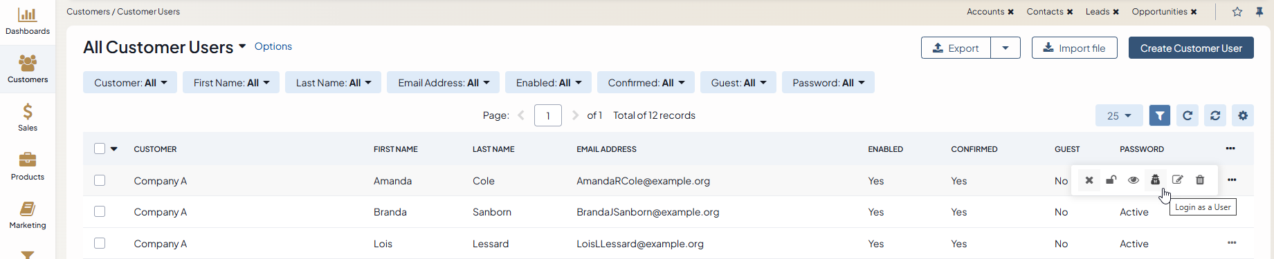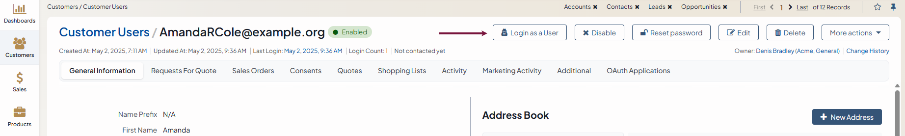 Click Log in as a User on the top right to impersonate a customer user from the customer user view page.