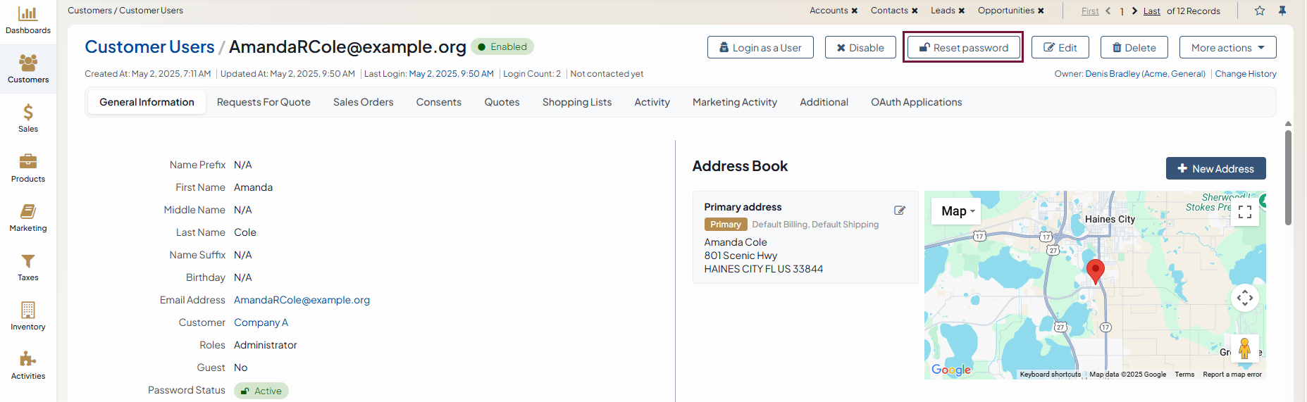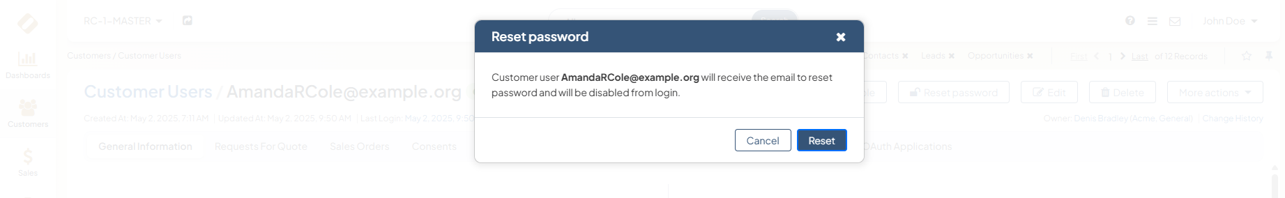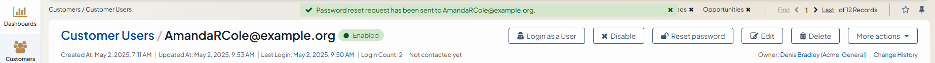 An administrator can request the customer user to change their password by clicking the Reset Password button on the customer user’s profile page: