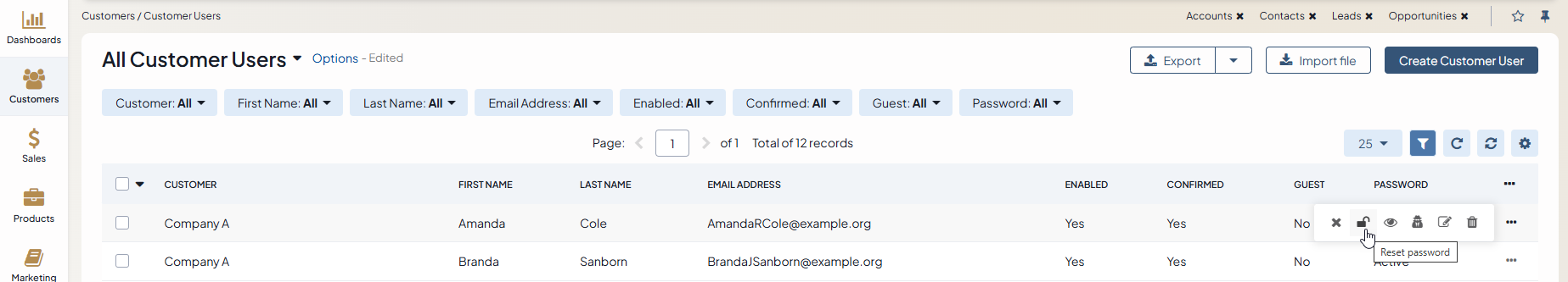 Alternatively, you can reset the password for a specific customer user from the grid of all customer users. For this, hover over the ellipsis menu at the end of the row of the selected customer user, and click Reset Password.