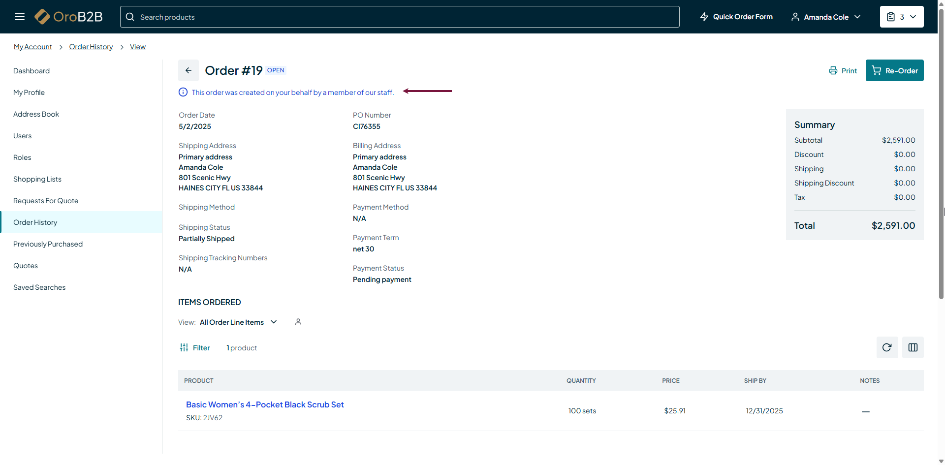 If a back-office user placed an order on behalf of the customer user, this will be reflected on the order view page in the storefront with the following note: This order was created on your behalf by a member of our staff.