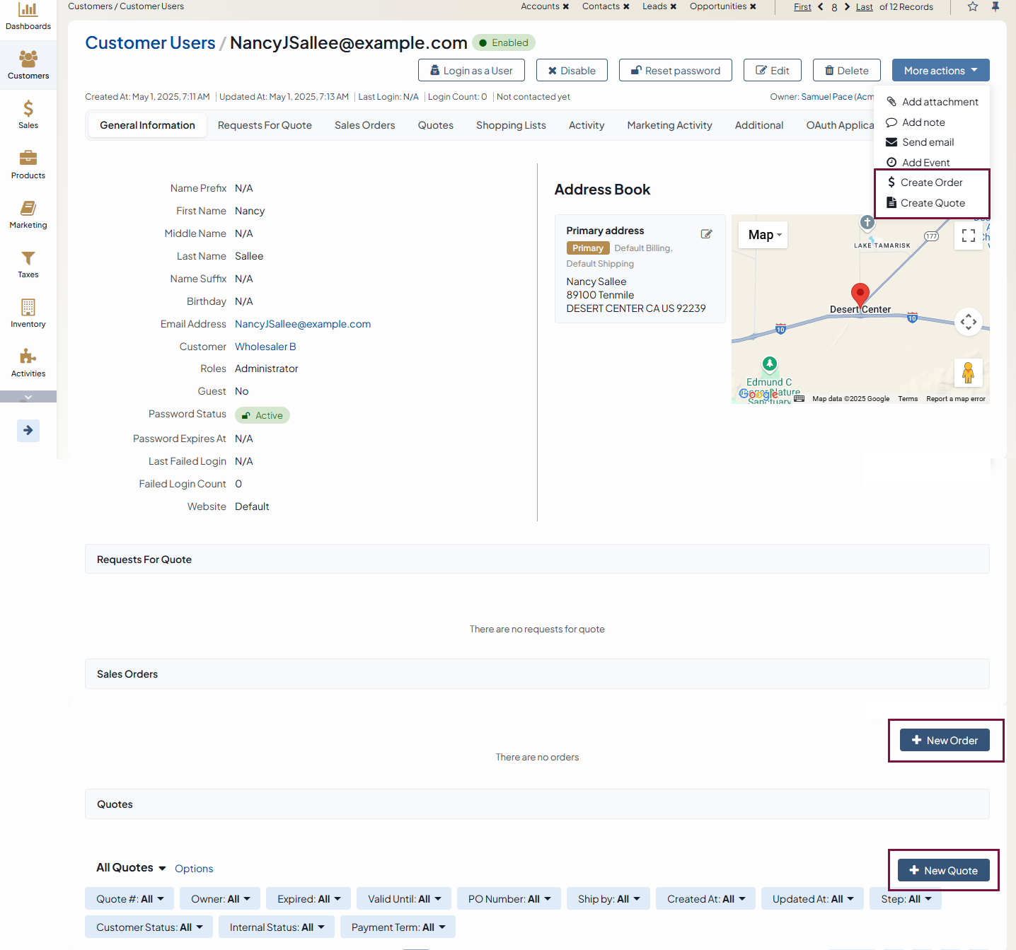 Quick action buttons enable you to create a new address, order, and quote directly from the customer user view page. Click the button to open the required form for data input. The form can be displayed in a new browser tab, a popup dialog window, or replace the current page, depending on its system configuration.