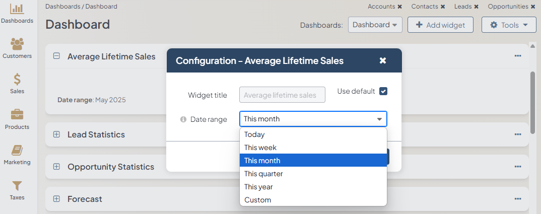Widget title — the name displayed on the dashboard. To change the name, clear the Use Default checkbox and provide a new name.
