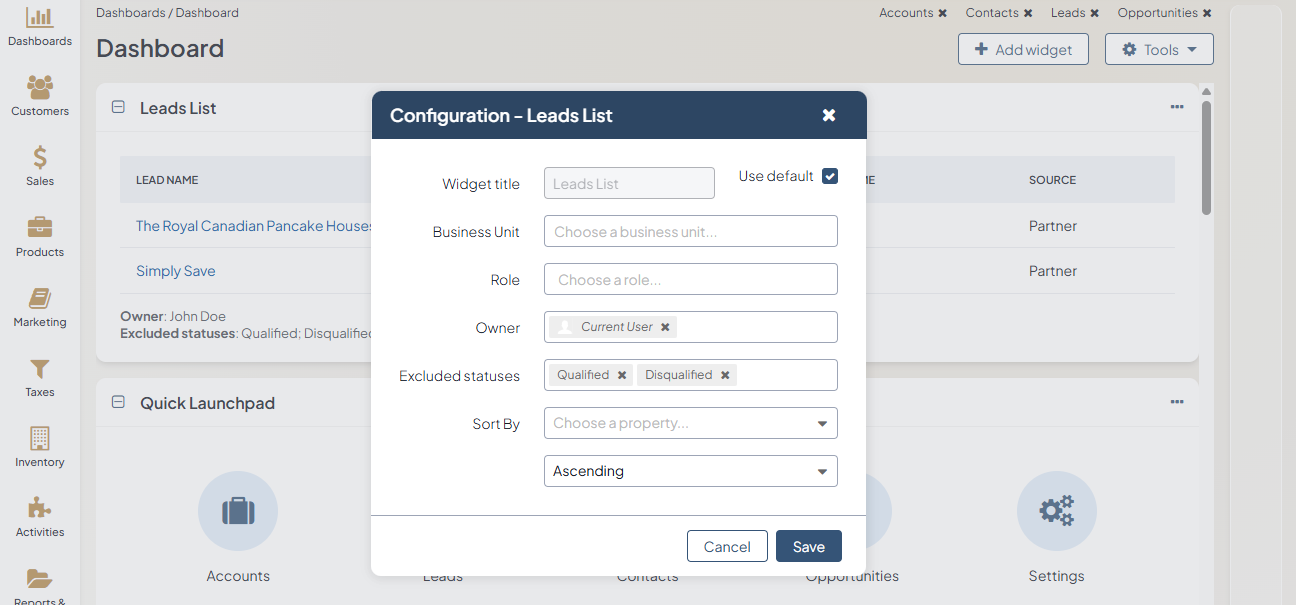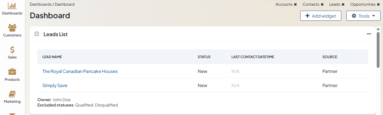 The Leads List widget displays the list of leads that can be configured to show only leads in certain conditions, e.g., only open leads owned by the current user. The widget displays only the current user’s open items but can be configured to display any necessary data.