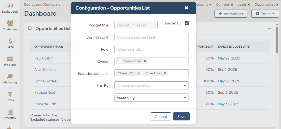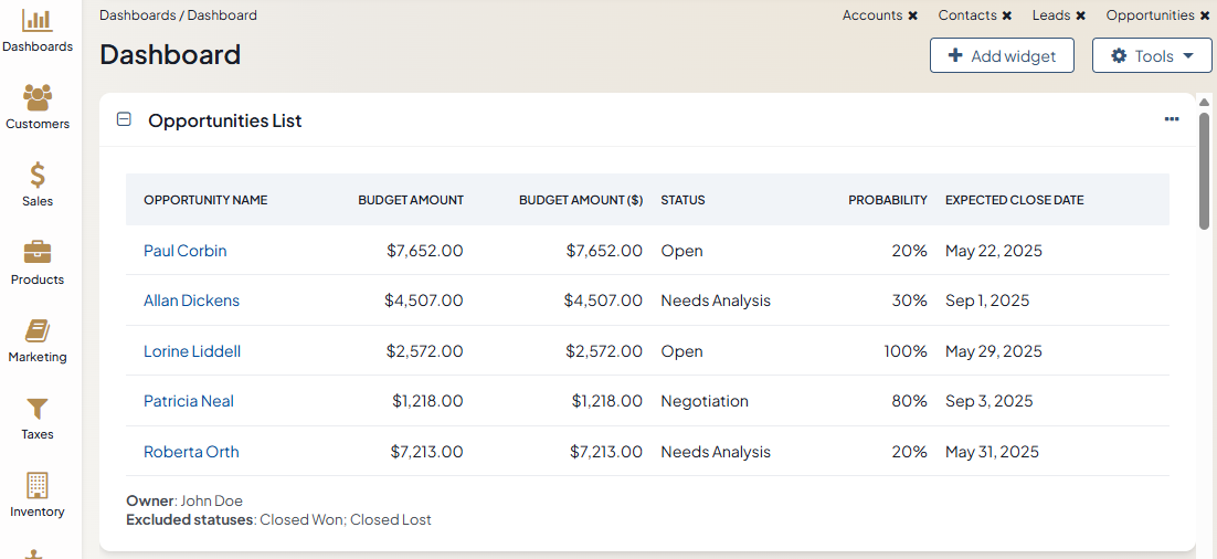 The Opportunities List widget displays the list of opportunities that can be configured to show only opportunities in certain conditions, e.g. only open opportunities that are owned by the current user.