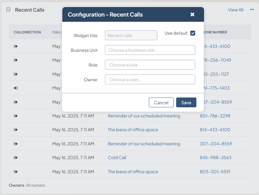 Widget title — the name displayed on the dashboard. To change the name, clear the Use Default checkbox and provide a new name.