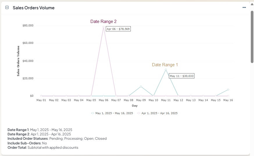 Date Range 2 — the second time period that displays the sales order volume over the selected period. To choose the date range, select the Starting At option in the dropdown and set the date to start the range. The chart uses the x-axis of Date Range 1 to illustrate its own period. Remember, that you specify only their starting date, while their end date is determined automatically by the duration of Date Range 1.