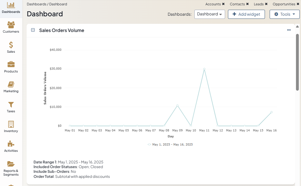 This widget displays a configurable line chart based on the total sales order amount for the selected period of time to easily assess the sales order volume over a period of time, and to compare sales order volume over multiple periods of time if needed.