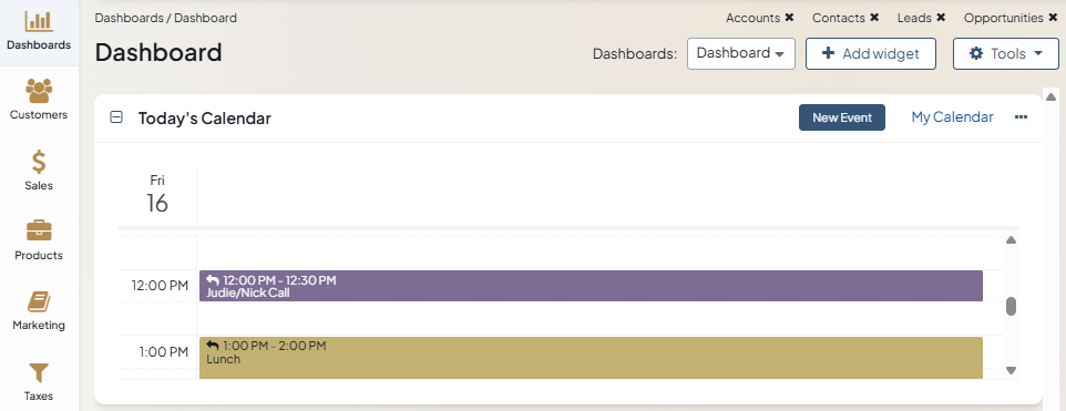 The Today’s Calendar widget displays planned events and your tasks due today. The events may belong to your personal calendar or other calendars that you watch.