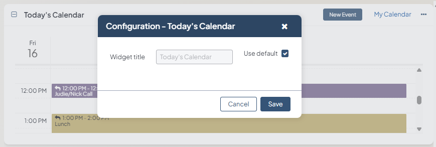 Widget title — the name displayed on the dashboard. To change the name, clear the Use Default checkbox and provide a new name.
