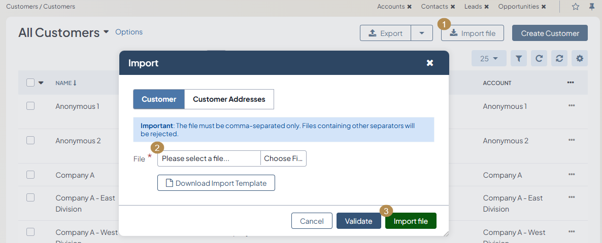 In the Import dialog, click Choose File, select the .csv file you prepared, and then click Import File.