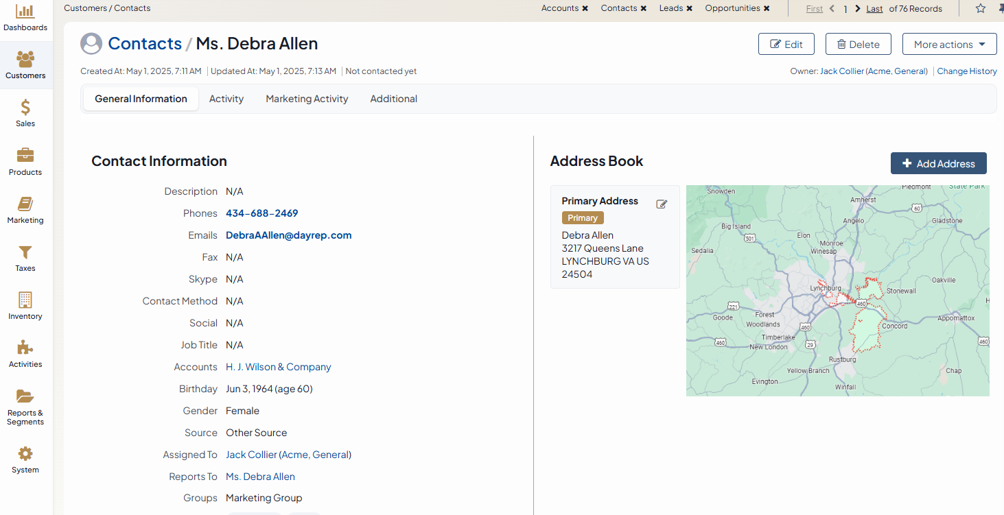 To view more details of a specific record and to work directly with the record (i.e., create a task related to a customer, appoint a calendar event for a user, turn a cart into an order, share a contact, and so on), you need to get to its details page (as in the example).