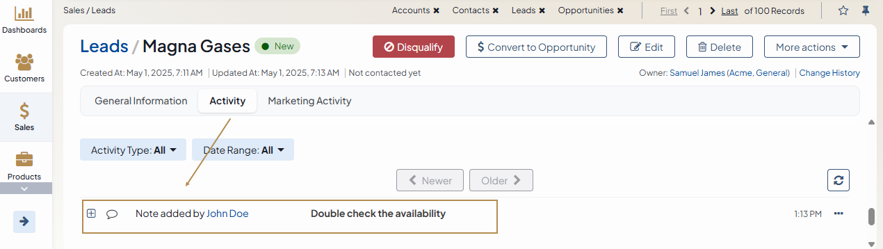 All the notes added to a record are displayed and can be reached from the Activity section of the record pages: