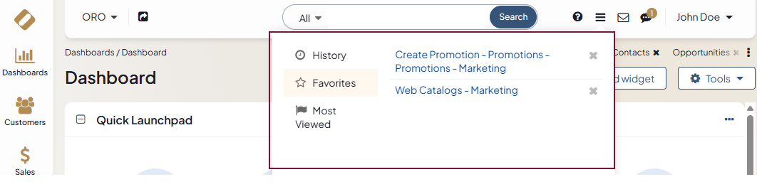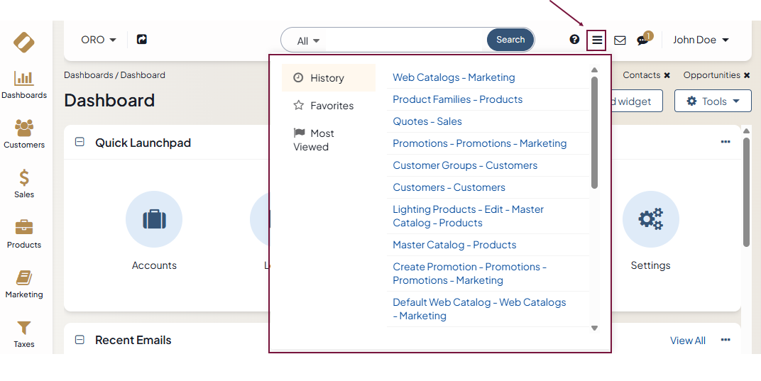 The “hamburger” icon next to the user menu contains a history of your page views, the list of your favorite pages, and the list of the most viewed pages in the Oro application.