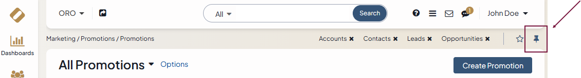 You can pin a page to the header and return to it at any time with one click. Some pages, such as Dashboards or Calendars, cannot be pinned.