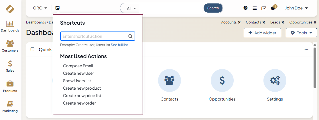 Shortcuts are used to perform everyday actions from anywhere quickly. They can also be used to create new records and navigate the system easily. Shortcuts are handy when you are not sure where an entity is in a menu.