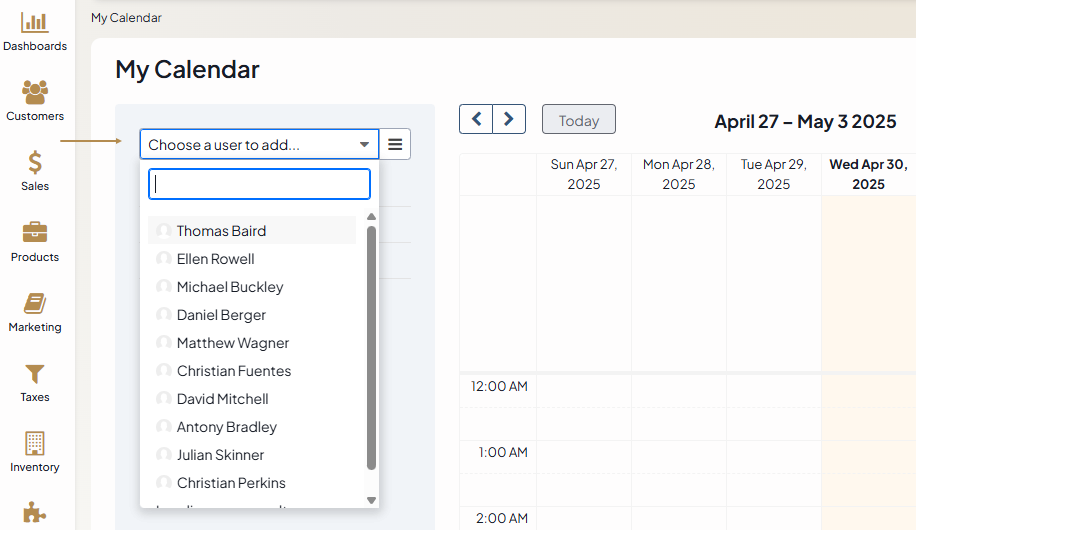 Use the search field to quickly find the required user: start entering their name and click the required name from the dynamically filtered suggestions. You can also click the hamburger menu next to the list to select the required user in the dialog box using filters, etc.