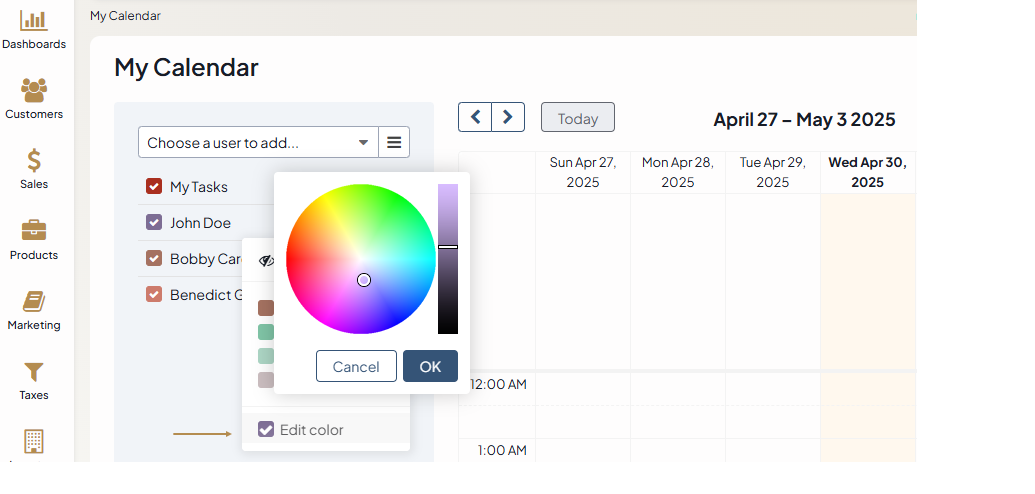 Click the ellipsis menu that appears at the end of the corresponding row, and click to choose the desired color (either from the default color box, or custom color wheel).
