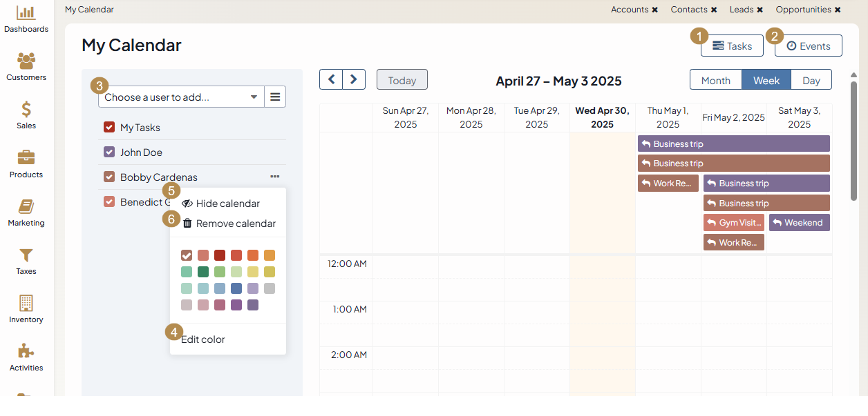 Hidden calendars do not appear in the right part of the page and in the Today’s Calendar widget.