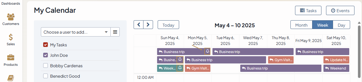 You can add or remove calendars that you want to watch from the calendar panel on the left. By default, you have My Tasks calendar showing your tasks by their due dates, all existing system calendars, and your personal calendar.