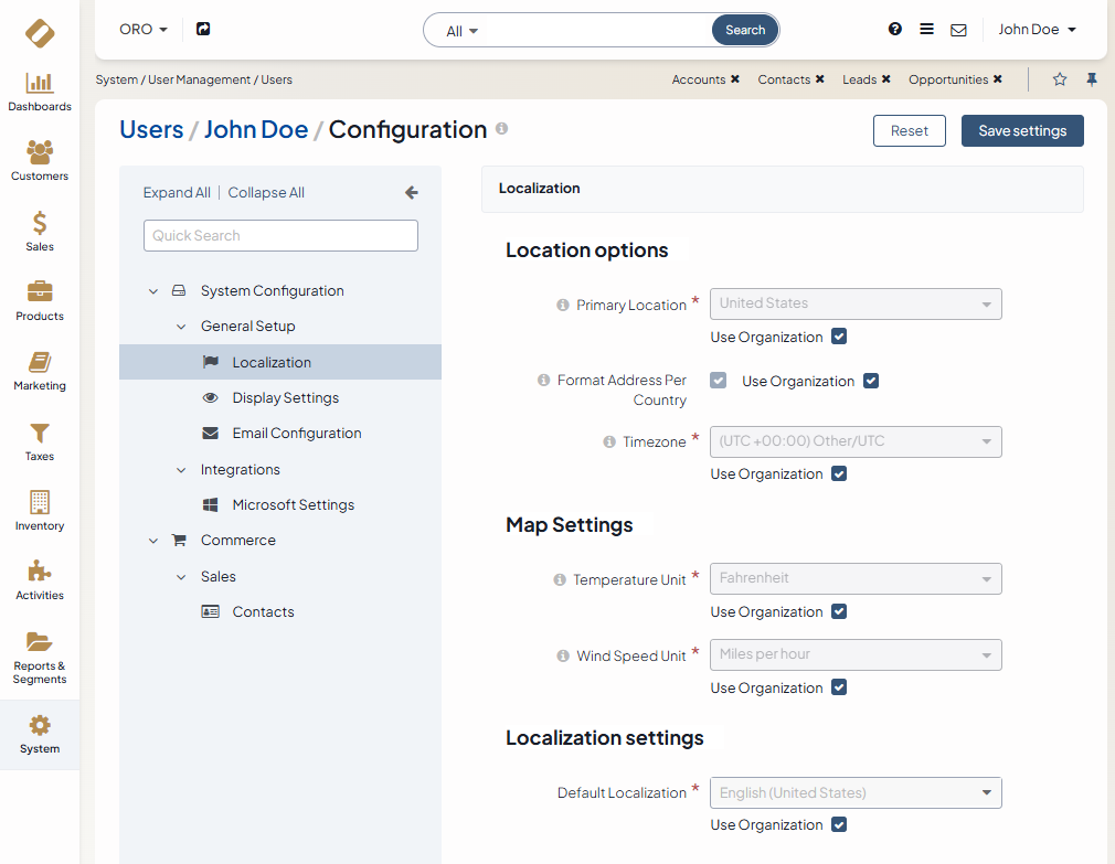 In this section, you can personalize the configuration of your Oro application. If made through your profile menu, this configuration does not affect other users. To configure the settings for the whole system, please see the System Configuration guide.