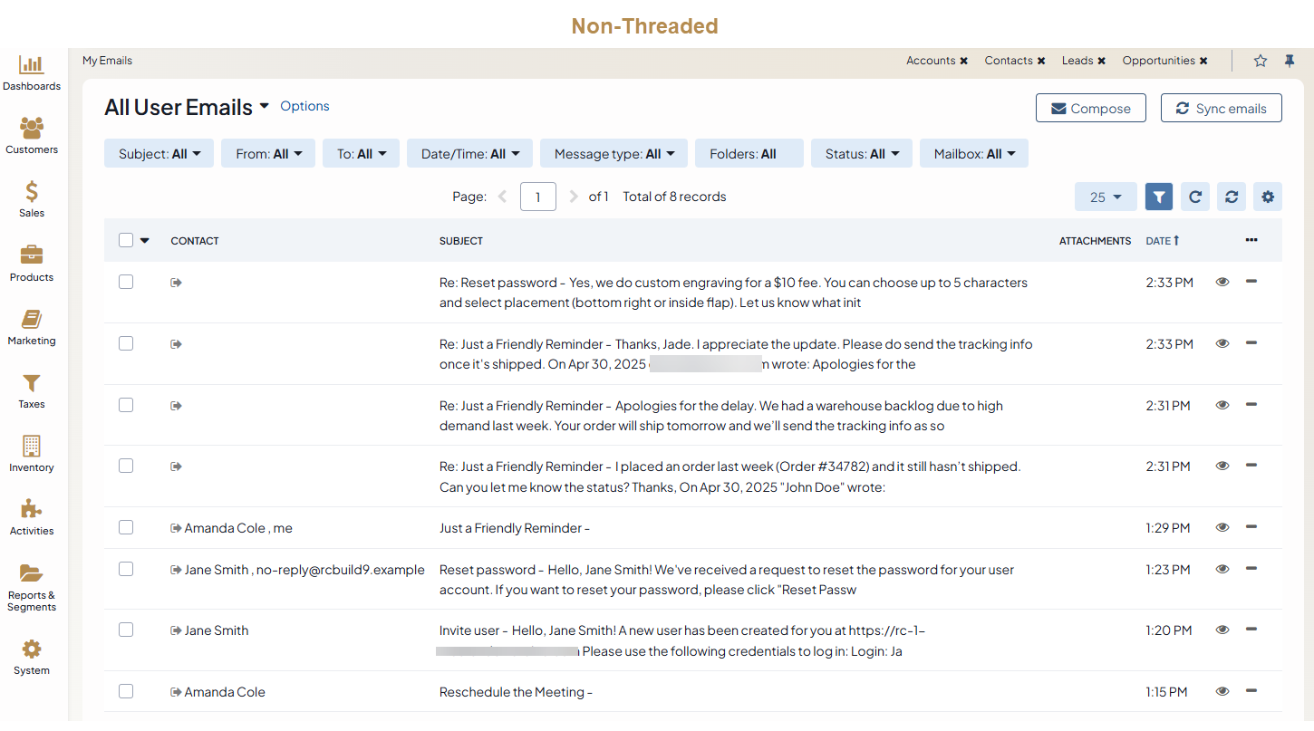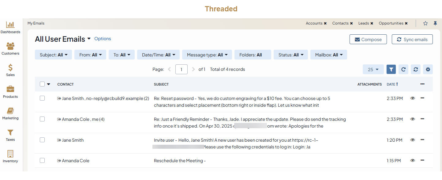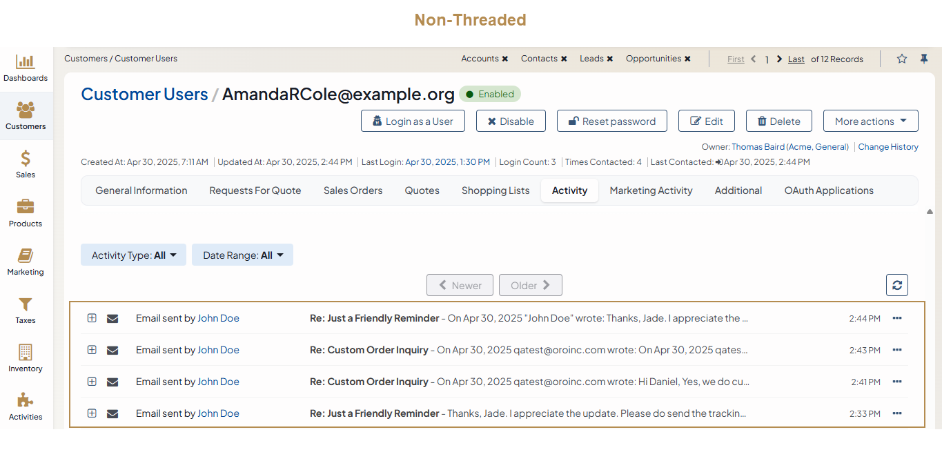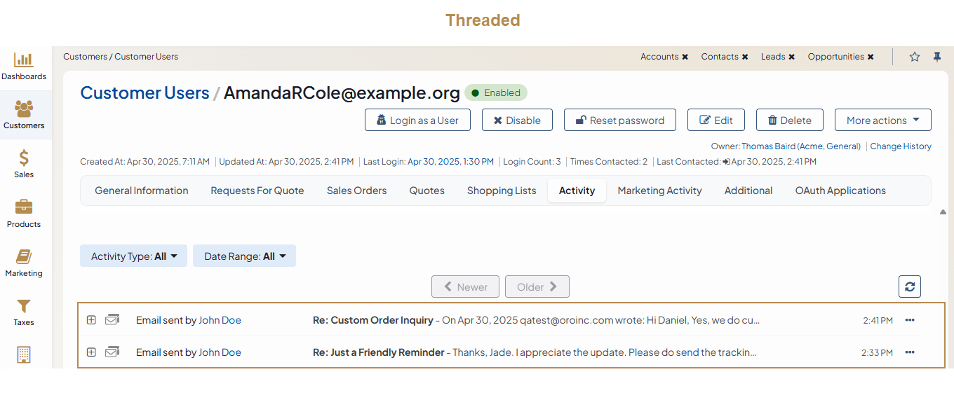 Display Emails In Activity Lists As — Defines how emails and replies are displayed under the Activity menu of a selected record.