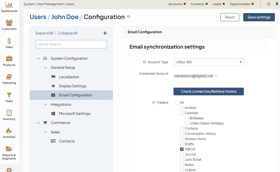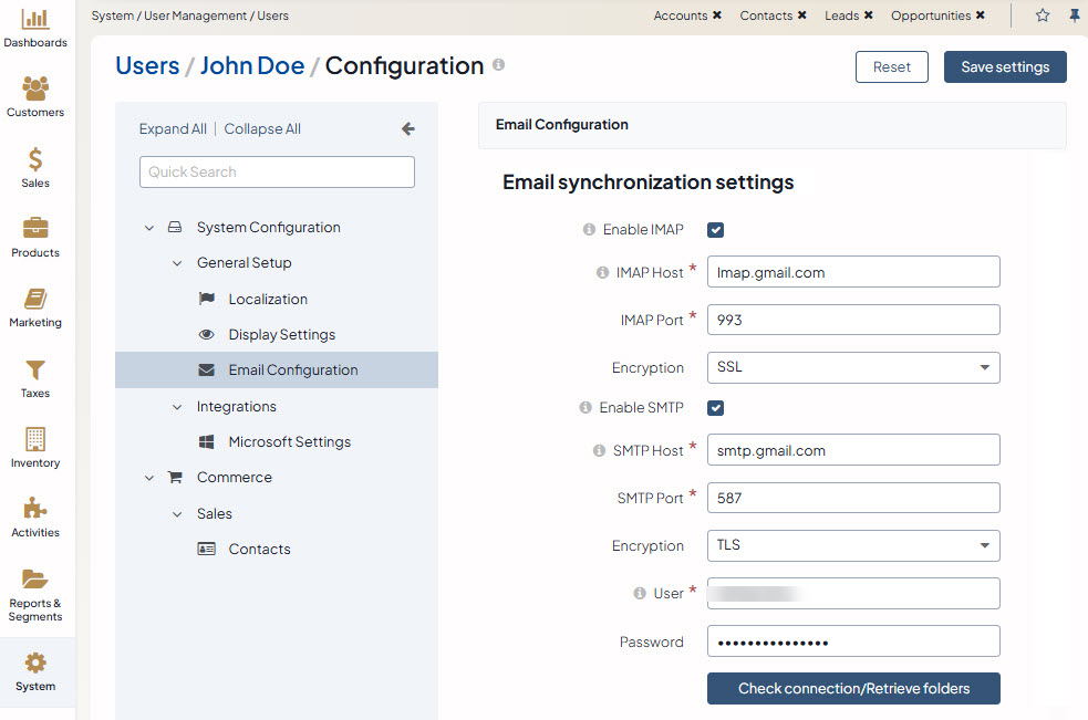 Click Check Connection/Retrieve Folders. After successful connection, a list of folders will be loaded. Check the folders that you wish to be synchronized (e.g., Inbox).