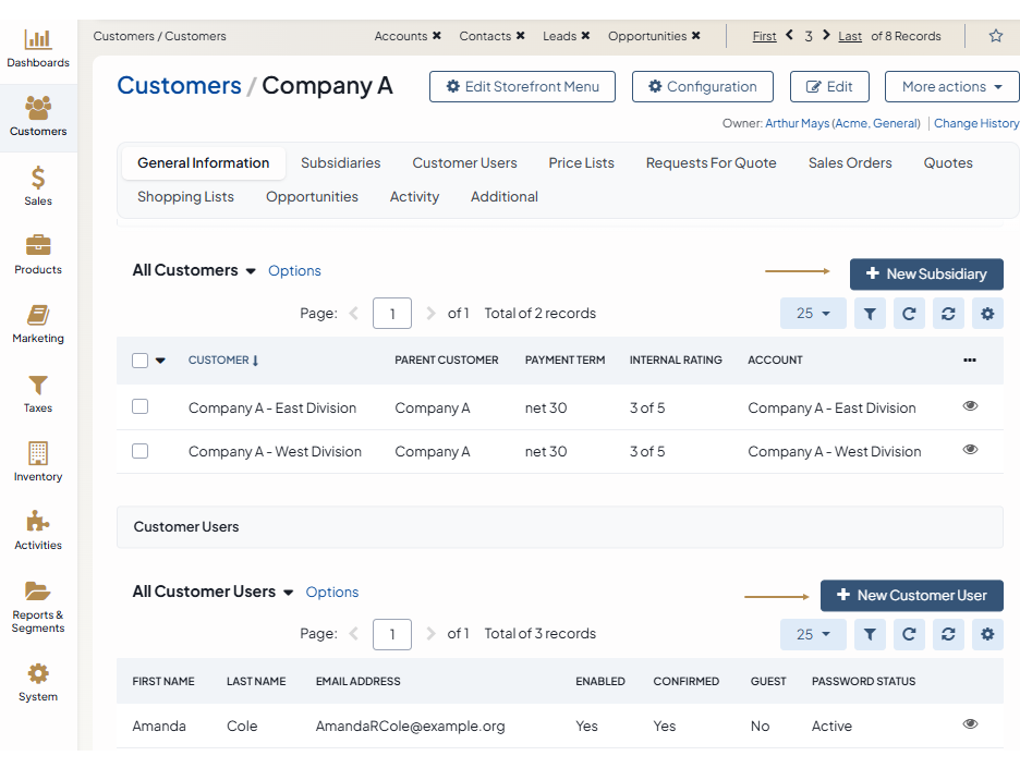Quick Create Actions — Select the preferred way to display the quick creation buttons form. The buttons with quick actions appear on the customer, customer user, and customer group view pages. When clicked, the form can be displayed in a new browser tab, a popup dialog window, or replace the current page.