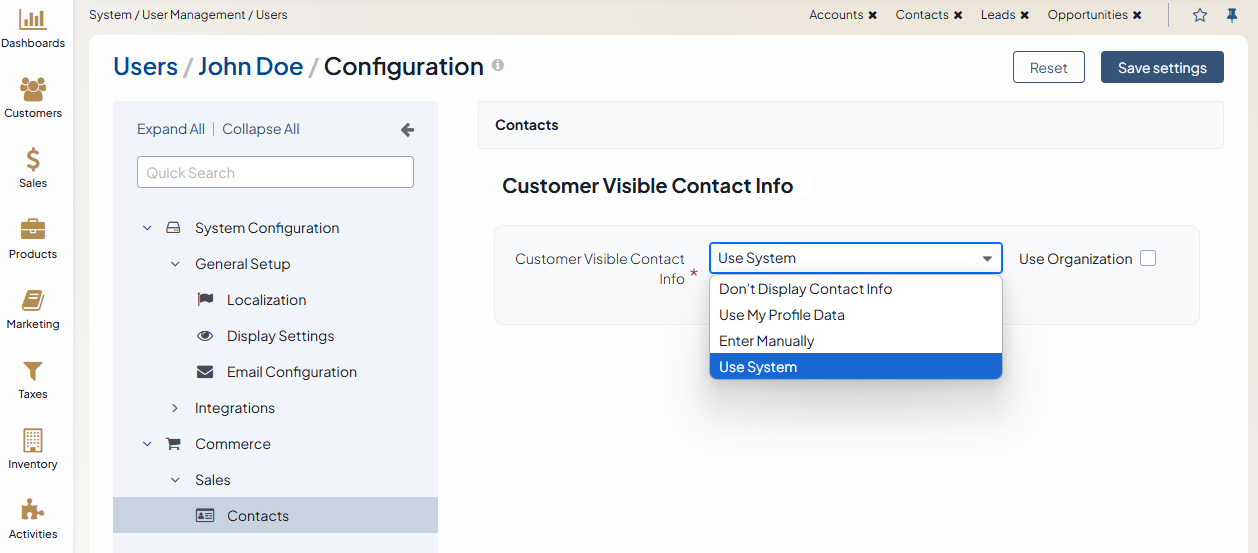 In the Customer Visible Contact Info list, the user will see the options enabled and selected in Available User Options on the system, website, or organization levels.