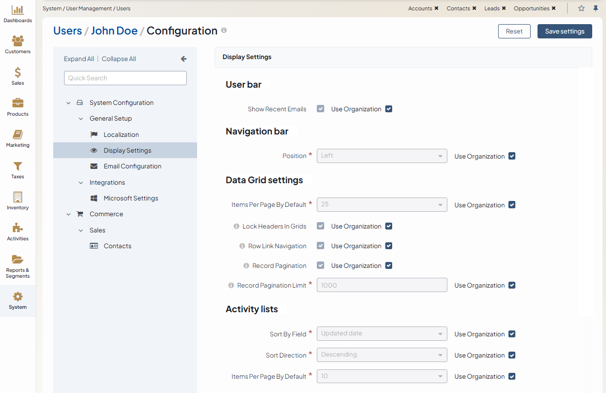 User-level configuration settings can fall back to organization settings. For this, select the Use Organization checkbox next to the selected option. To go back to the default user-level settings, click Reset on the top right.