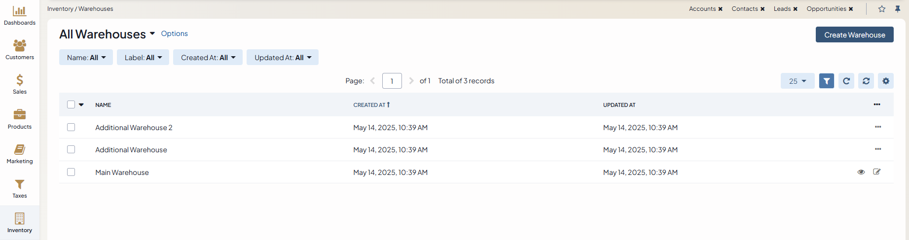 To view all warehouses, navigate to Inventory > Warehouses in the main menu.