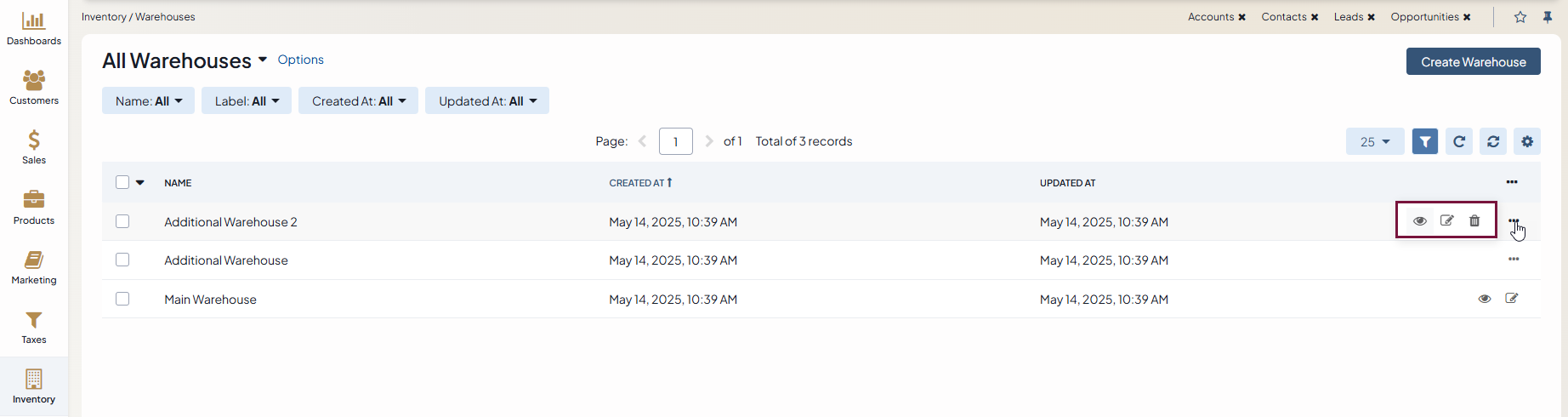 View Warehouse details: Click on the warehouse to open its details page.
