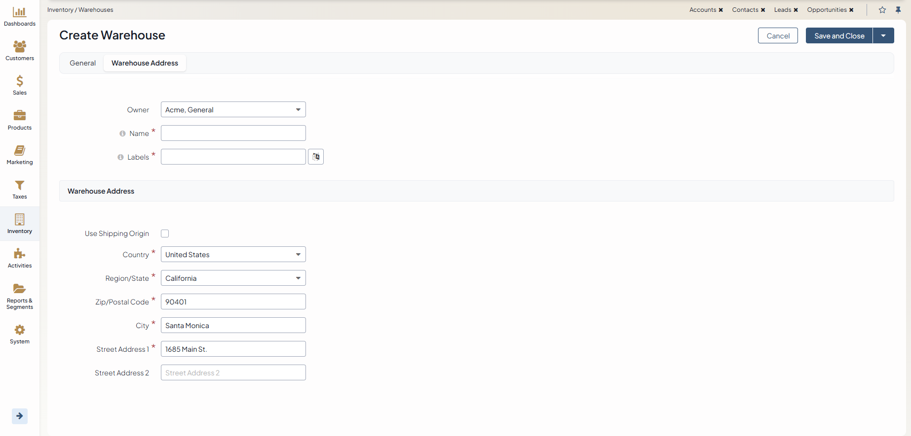 To use a custom warehouse address, enter the Country, Region/State, Zip/Postal code, City, and street address.